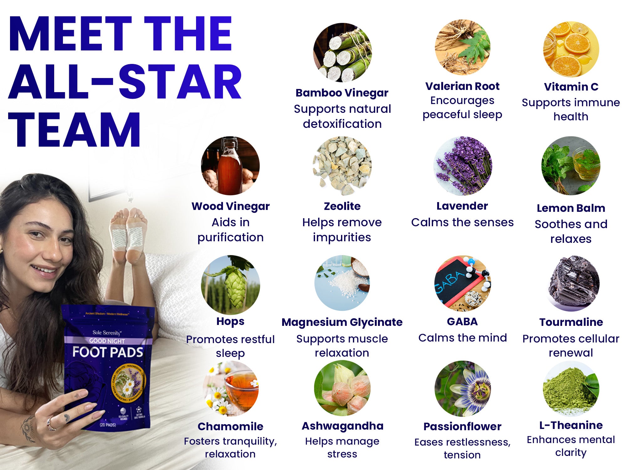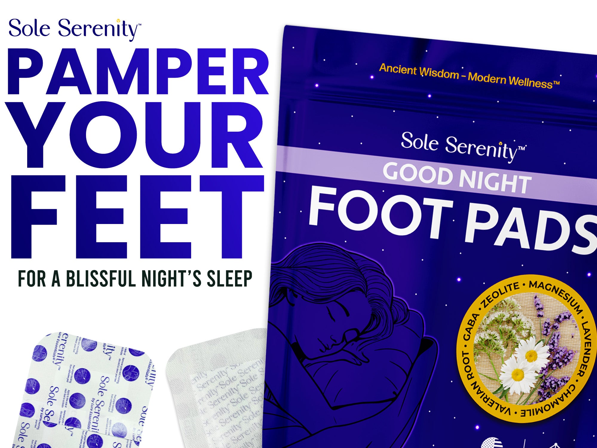 Experience deep rest and gentle detoxification with Sole Serenity Good Night foot pads. In today's fast-paced world, quality sleep and cleansing are essential for overall wellbeing. This advanced vegan formula combines the powerful detoxifying properties of volcanic Zeolite with nature's most effective sleep-promoting botanicals. Unlike standard foot pads, our innovative blend features calming Lavender, Valerian Root, and Chamomile, enhanced with Magnesium Glycinate for optimal relaxation and absorption. The addition of stress-reducing herbs like Lemon Balm, Ashwagandha, and Passionflower helps quiet an overactive mind.