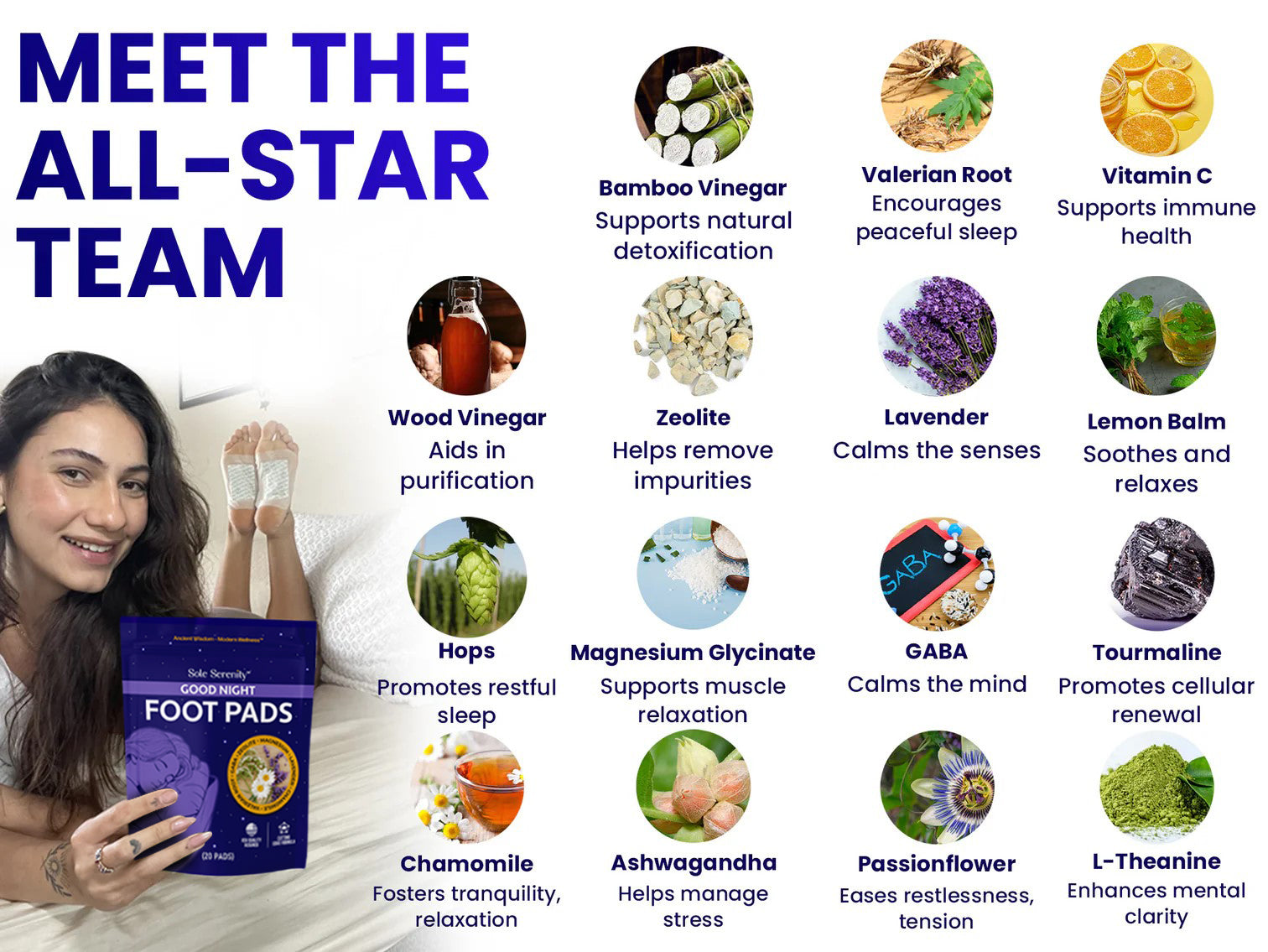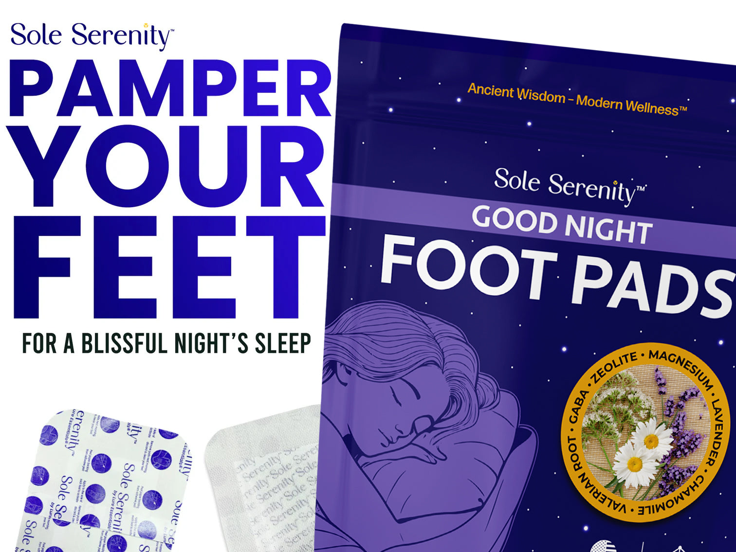 Experience deep rest and gentle detoxification with Sole Serenity Good Night foot pads. In today's fast-paced world, quality sleep and cleansing are essential for overall wellbeing. This advanced vegan formula combines the powerful detoxifying properties of volcanic Zeolite with nature's most effective sleep-promoting botanicals. Unlike standard foot pads, our innovative blend features calming Lavender, Valerian Root, and Chamomile, enhanced with Magnesium Glycinate for optimal relaxation and absorption. The addition of stress-reducing herbs like Lemon Balm, Ashwagandha, and Passionflower helps quiet an overactive mind.