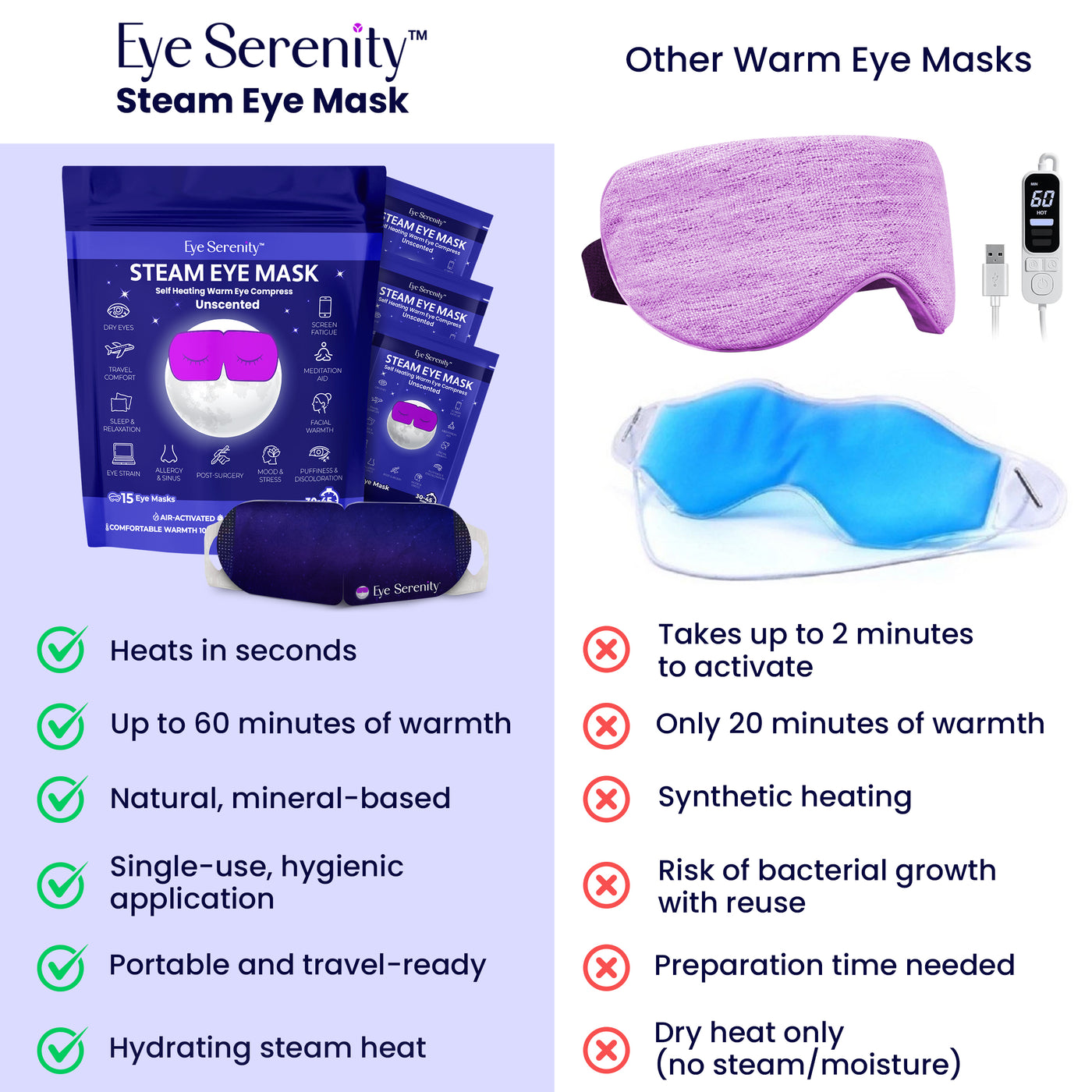 Eye Serenity masks contain natural minerals that activate upon exposure to air, creating gentle steam heat up to 104°F for about 20 minutes. No microwaves, no chargers, no fuss.